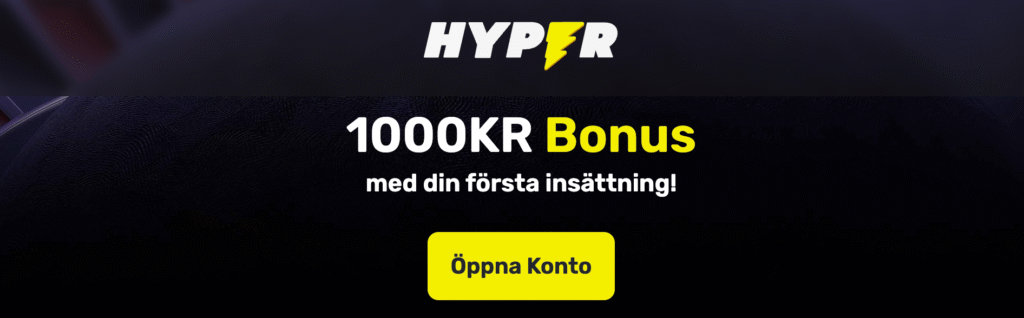 Hyper Casino erbjuder en välkomstbonus på 100 % upp till 1 000 kr för nya spelare. Bonusen aktiveras i samband med din första insättning och följer tydliga villkor för minsta insättning, omsättningskrav, tidsgräns och vilka spel som ingår i bonusen.